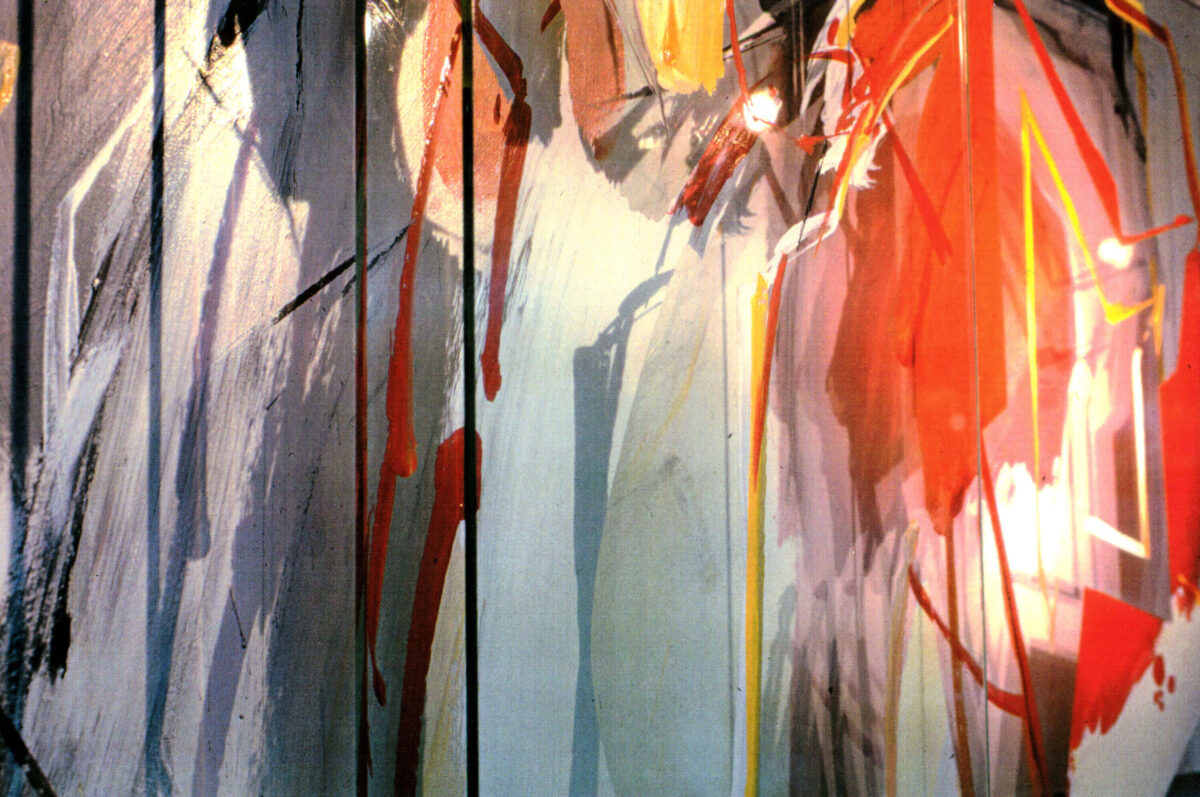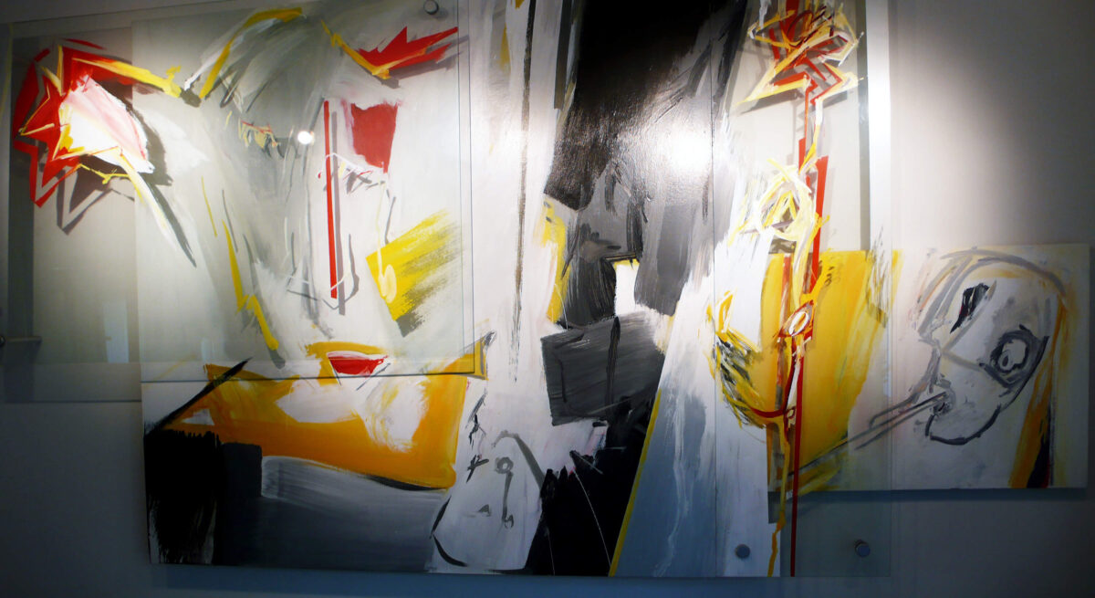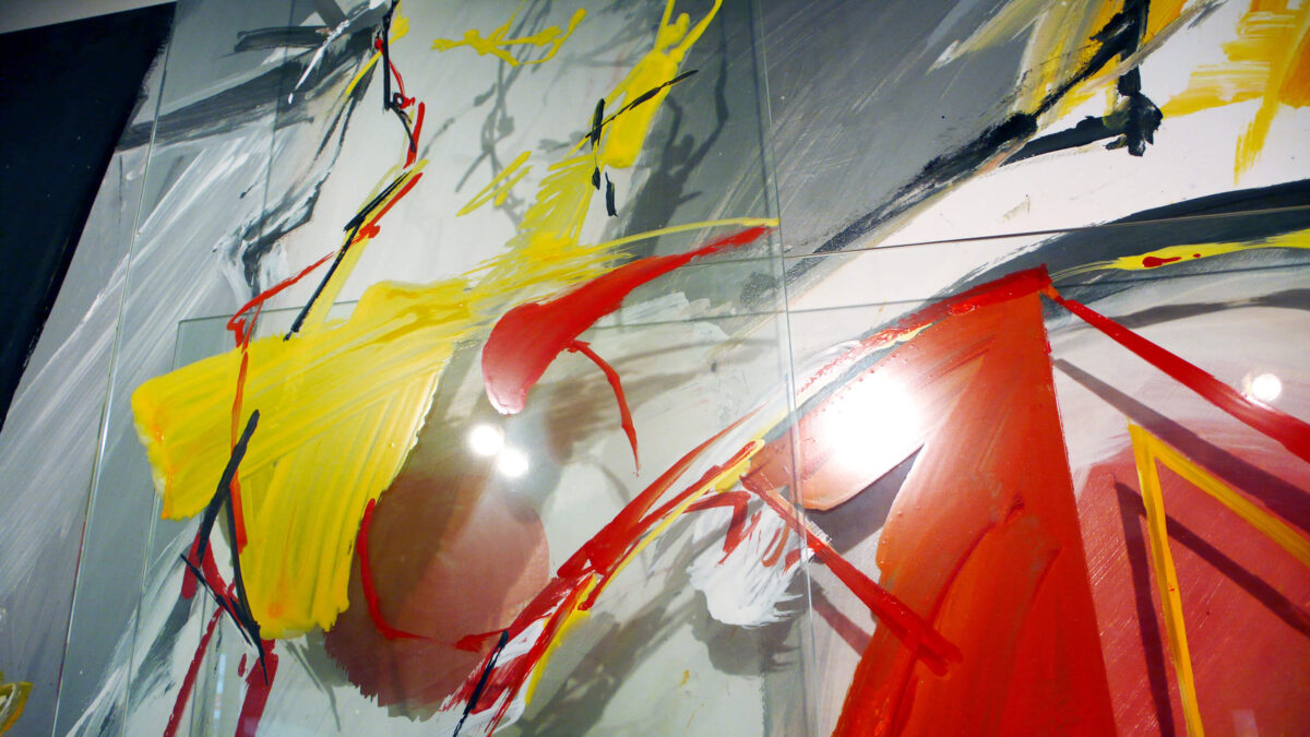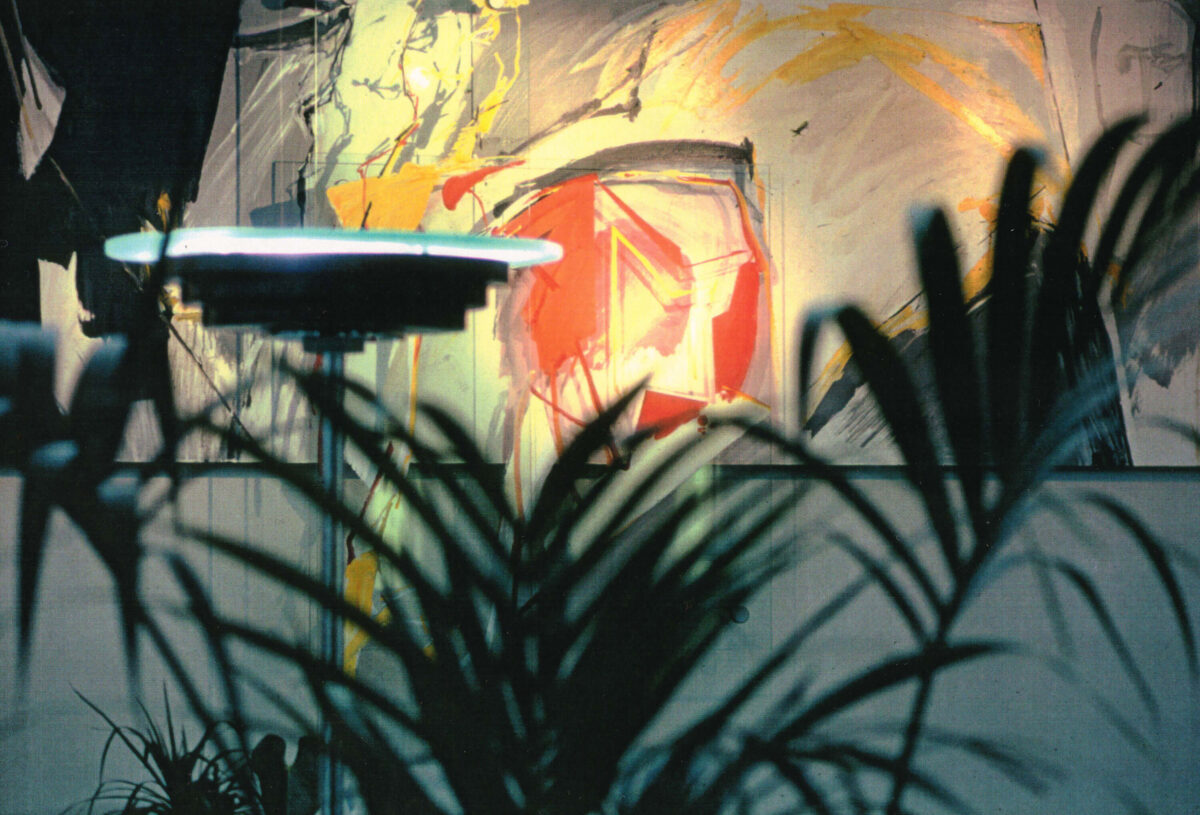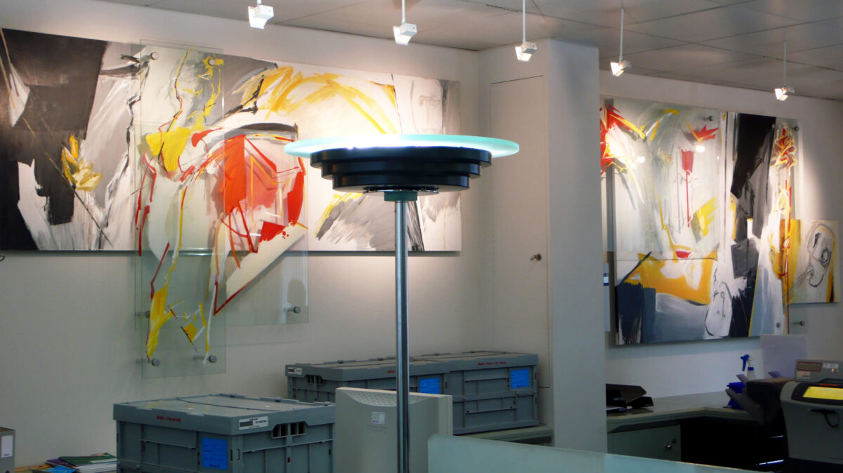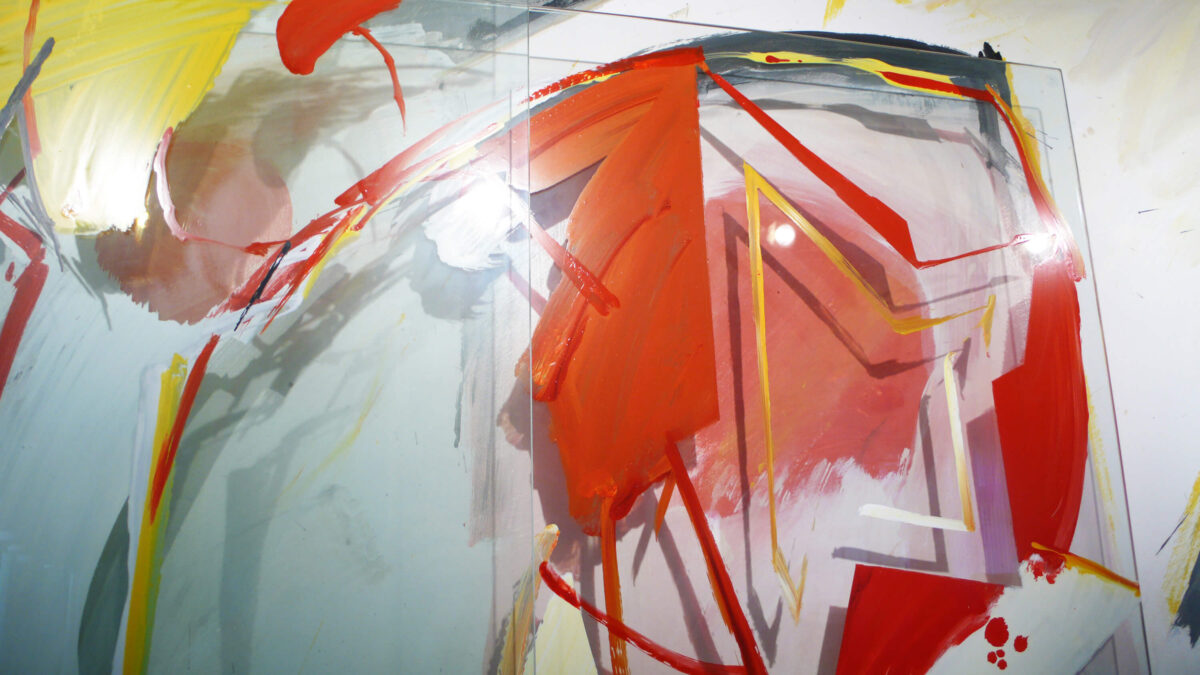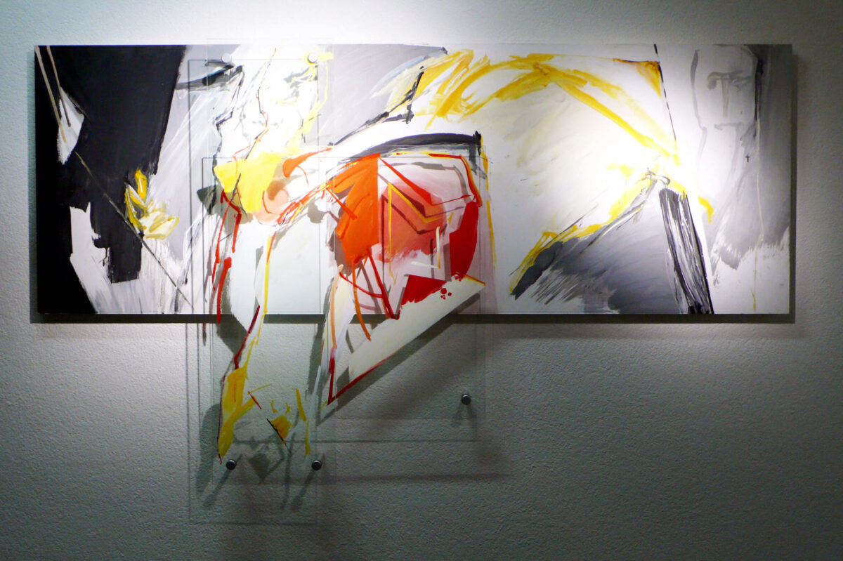 Den Malereien auf Holzplatten sind bemalte Gläser vorgelagert, deren Schatten durch eine gezielte Beleuchtung mit dem dahinterliegenden Farbraum verschmelzen, die Formen akzentuierten und zum Teil erst figürlich lesbar machen.