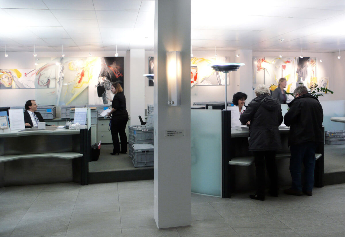 Im Wettbewerb für die Gestaltung der neuen Schalterhalle der Volksbank (heute CS) in der Langenthaler Marktgasse ging das Projekt «Mit den Köpfen» als Sieger hervor. Realisiert wurde ein dreiteiliges Bild auf der Rückwand des offenen Raumes.