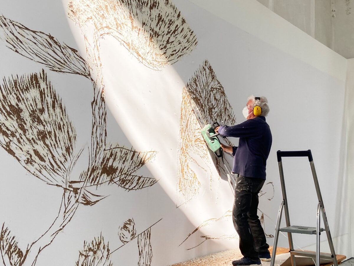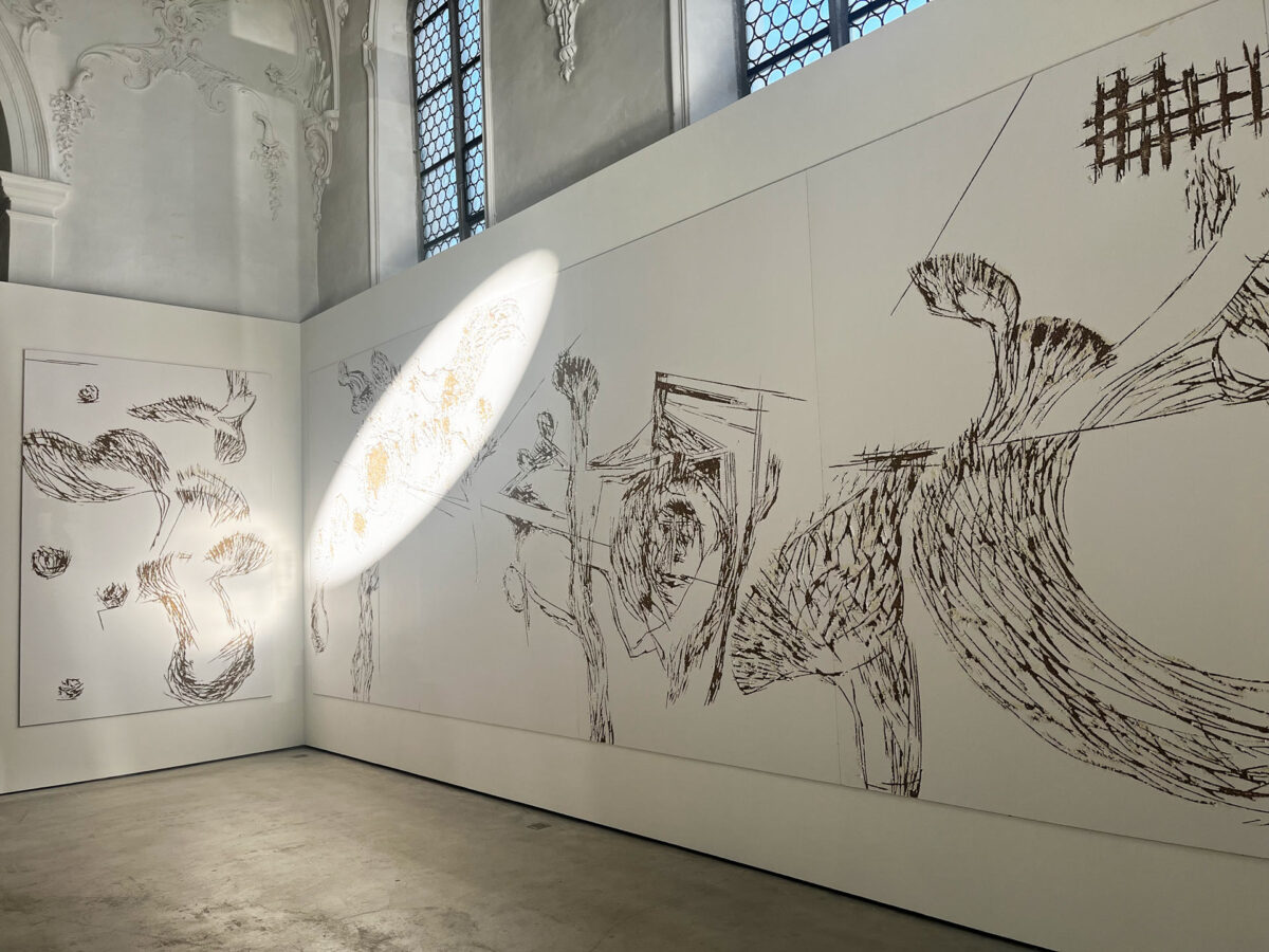 Wer sich ohne Karte und Kompass in unbekanntes Gebiet begibt, muss sich ganz auf seinen Orientierungssinn verlassen können. Wer sich ohne Entwurf und Vorstudien an die Gestaltung der zwei Seitenwände (je 310x1460cm) im Schiff des Hauses der Kunst St. Josef heranwagt, muss sich ganz auf seine Intuition verlassen können. Wo keine Wegweiser stehen, muss aus dem Moment heraus entschieden werden, wohin die Schritte führen sollen, in welche Richtung die Spuren gelegt werden müssen. Max Hari geht dieses Wagnis ein.